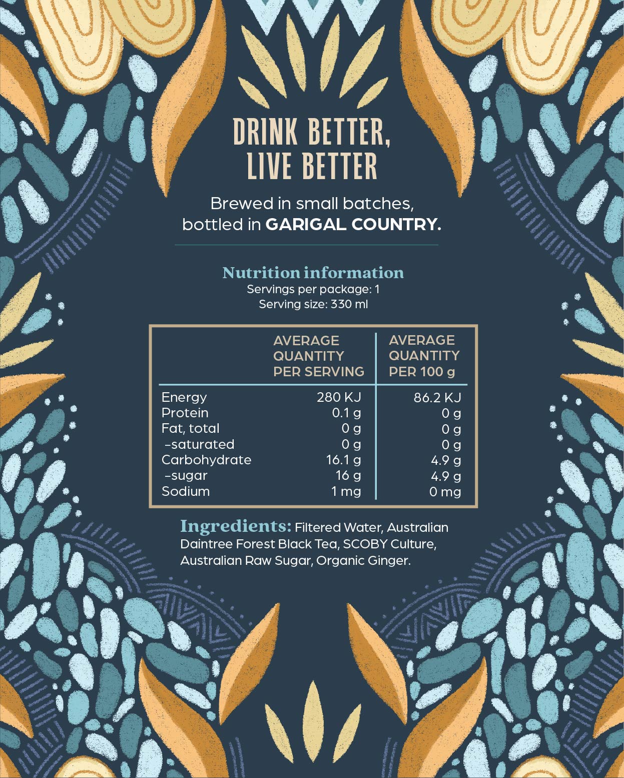 The Original Kombucha is brewed using a carefully selected blend of organic ingredients, including Australia’s own Daintree Forest black tea. The fermentation process allows the kombucha to develop a complex, balanced flavour profile. The black tea leaves impart a rich earthiness, while a hint of ginger is added to introduce a gentle warmth, setting the foundation for this refreshing kombucha.
